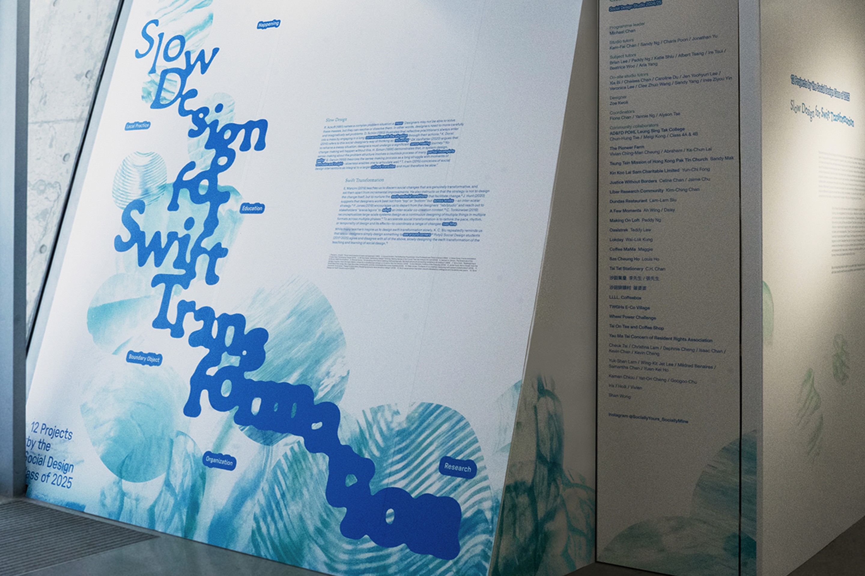 Building on the concept of "Slow Design for Swift Transformation", bodies of water are used as a metaphor to illustrate how people and actions interact, creating far-reaching effects. From tranquil ponds and tiny puddles to dynamic streams and vast oceans, each water form represents a different scale of influence. This concept invites viewers to consider how students engage in various types and scales of social actions. With each action rippling through society, they react with others and cause significant change over time.