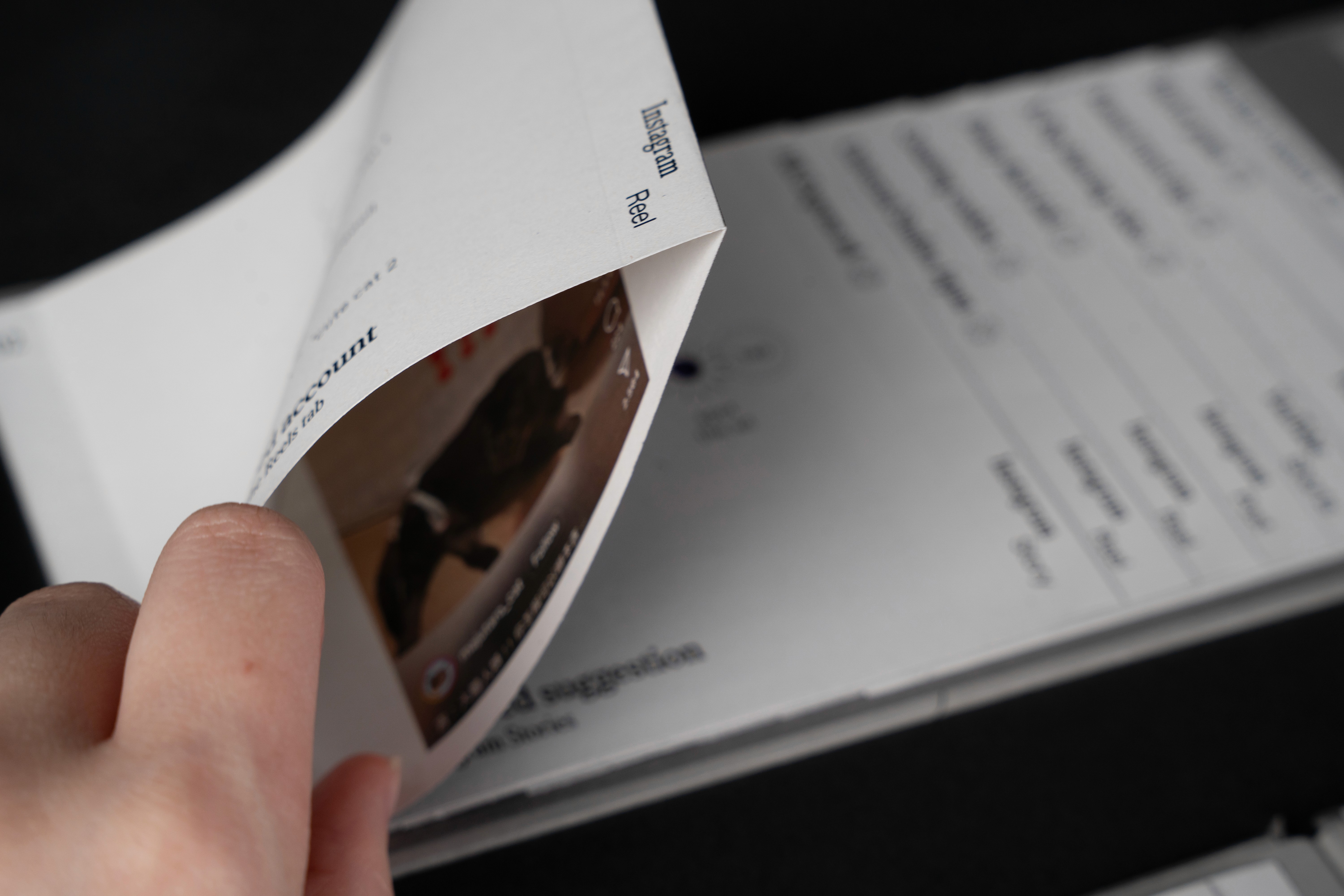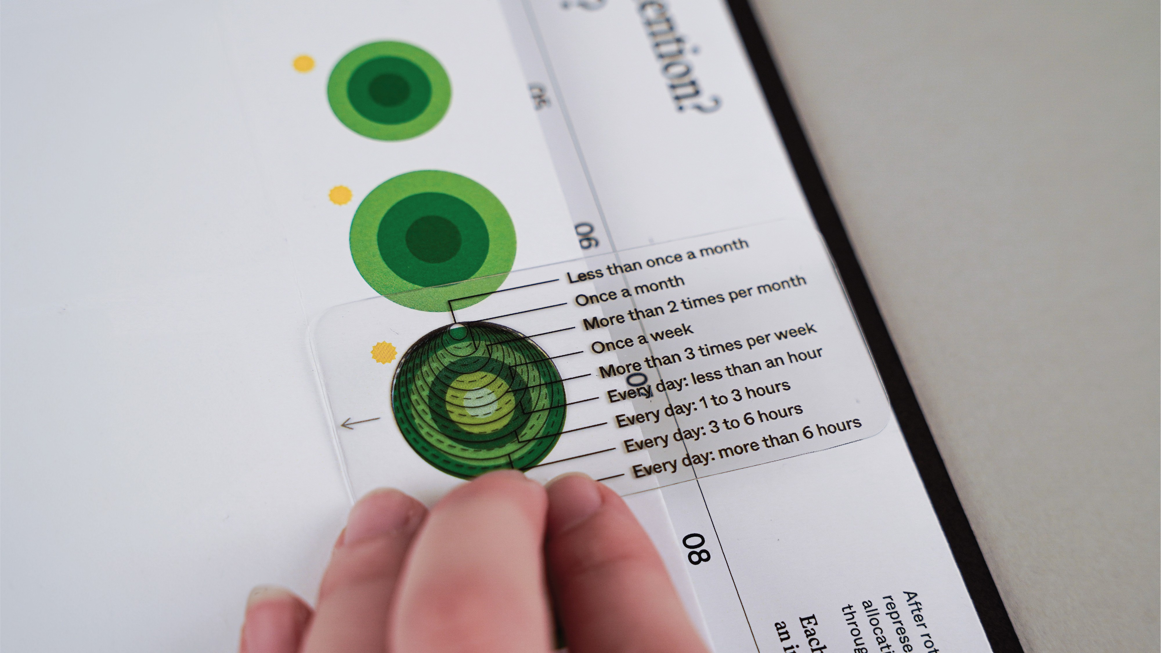 The dragon-scale binding allows readers to get an overview of the different information. Then, readers can look at how others discovered the information, peek at the original content, and understand its lasting impact, along with infographics of the time spent on each piece of information.